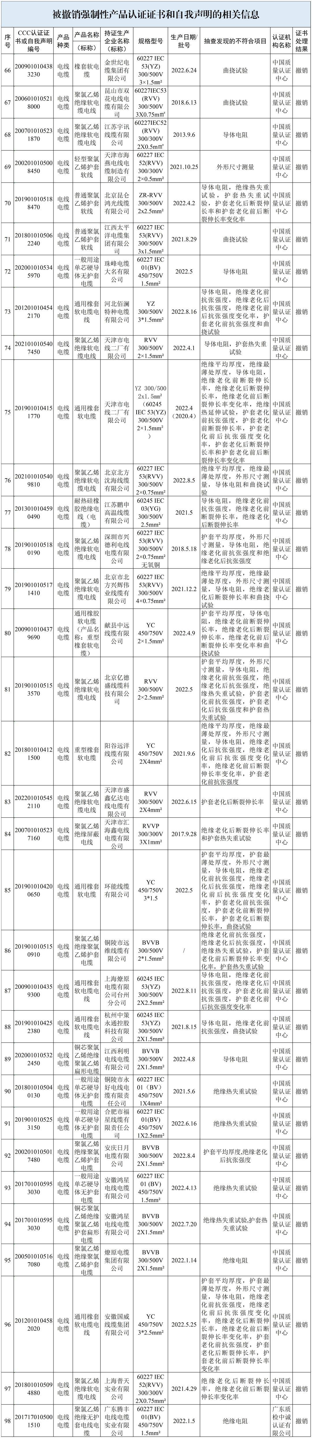 2023年5月4日,市場監(jiān)管總局發(fā)布2023年度第2期認(rèn)證有效性抽查結(jié)果,根據(jù)相關(guān)抽查信息,認(rèn)證機(jī)構(gòu)對不符合認(rèn)證要求的獲證企業(yè)已作出撤銷1057張強(qiáng)制性產(chǎn)品認(rèn)證證書的處理,其中,共有31家線纜企業(yè)被撤銷強(qiáng)制性產(chǎn)品認(rèn)證證書。